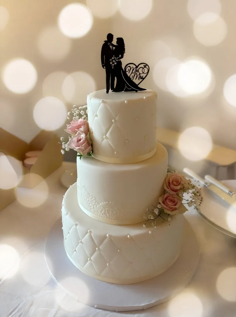 El diseño presenta una fina silueta de los novios compartiendo un momento íntimo, acompañada de un corazón clásico con las alianzas y el texto «Mr & Mrs». Es ligero, elegante y el complemento perfecto para tartas de cualquier estilo, desde las rústicas «naked cakes» hasta las cubiertas de fondant clásico.